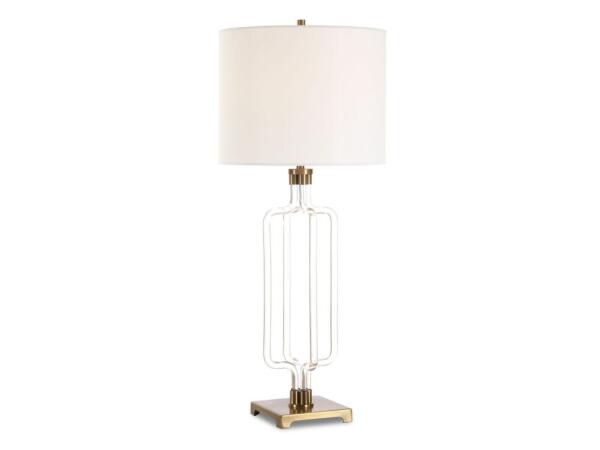 Crafted from clear acrylic, the Outline Cordless Table Lamp boasts a sleek and airy contemporary design complemented with brass plated