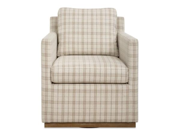 Experience effortless style and comfort with this swivel club chair featuring a solid wood plinth base in natural oak. Tailored