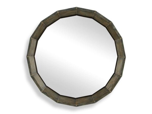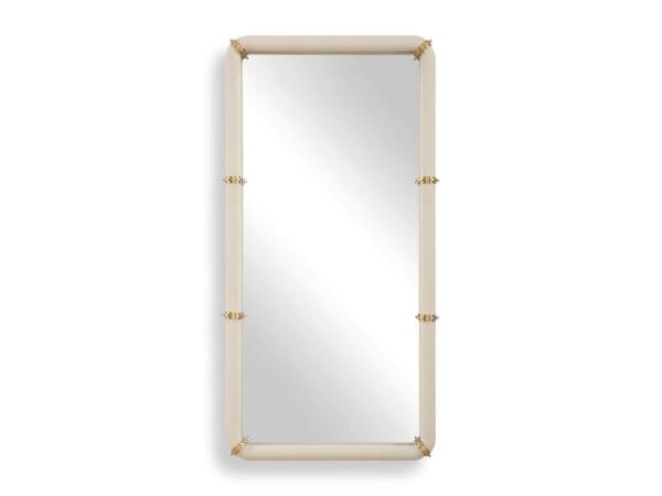 The Cyprus Mirror showcases a white faux shagreen leather wrap featuring brass plated steel bands that help elevate this sophisticated
