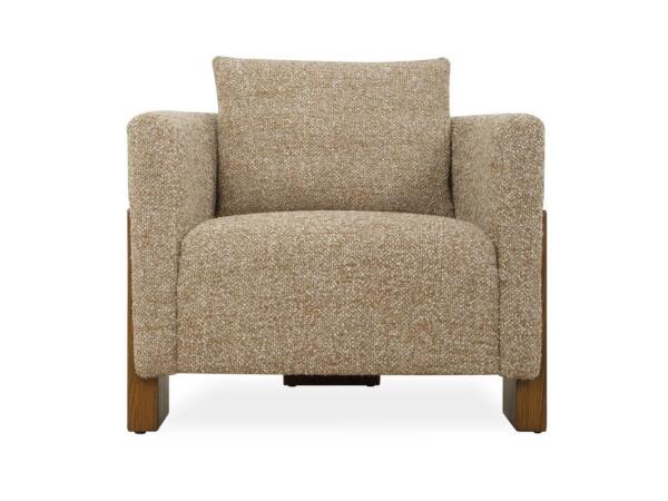 Three solid oak legs with a rich walnut finish provide a striking, architectural base for this accent chair. Fully upholstered