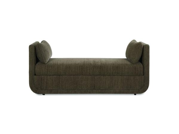 Curves abound creating style and ease, featuring a rounded frame that cradles the base, with two accent pillows. Fully upholstered
