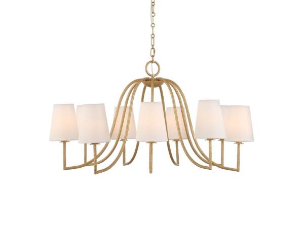 Elegant 9 Lt chandelier featuring a heavy textured golden finish with white linen fabric shades. 9-40 watt max candelabra sockets.
