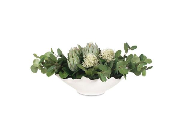 Bring natural artistry to your space with this striking botanical centerpiece. Featuring sculptural white protea blooms surrounded by lush eucalyptus