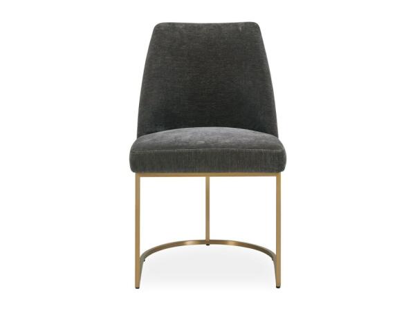 The Hanni dining chair features a sleek, curved steel frame in a brass plated finish. Upholstered in a charcoal polyester