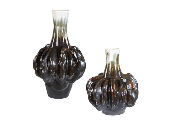 This elegant pair of gourd inspired ceramic vases are finished with a striking multi-tonal glaze that blends shades of creamy