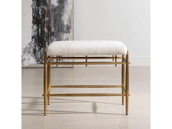 The Karleen small bench is a study in classic design, defined by its graceful fusiform silhouette and glamorous antique brass