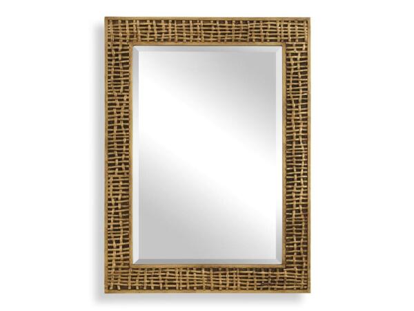 This unique mirror features a captivating, loosely woven motif finished in a heavily antiqued gold leaf. Mirror has a generous