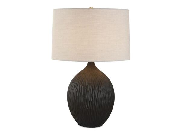 The Levee Table Lamp features a simple shaped ceramic base that is enhanced with a repeating chiseled pattern, finished in