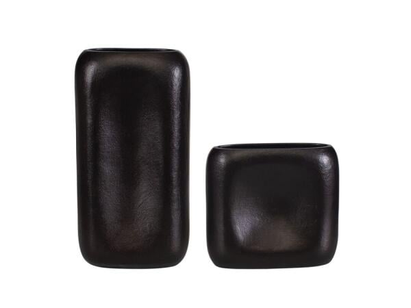 Crafted from aluminum and finished in deep brown, this set of two vases features a unique blend of modern geometry