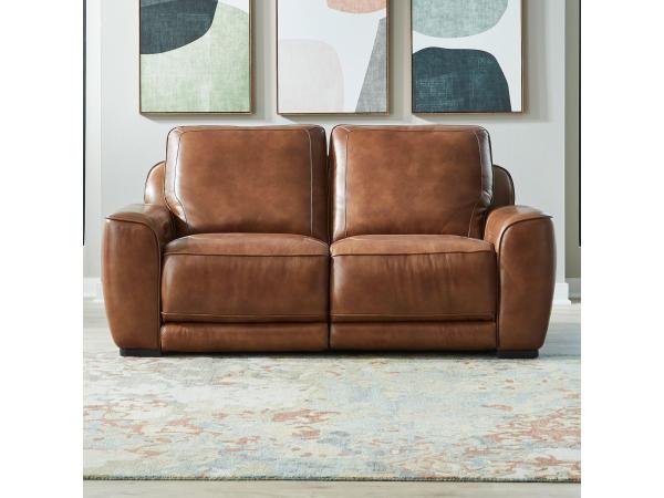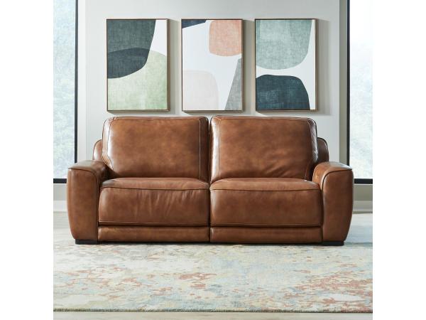 A dual power zero-wall reclining sofa with a synchronized power headrest and independent controls for personalized comfort. It combines a stationary aesthetic with motion functionality, detailed with decorative welting and top stitching.