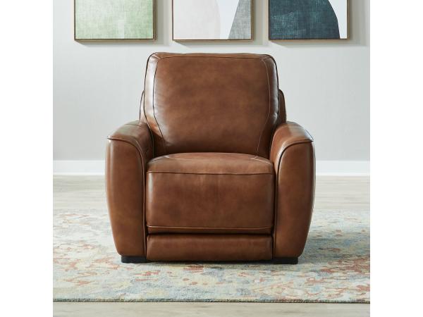A right-arm-facing recliner with dual power zero-wall recline and a synchronized power headrest for customized positioning. This piece includes ultra-soft plush seating and an elegant butter knife arm.