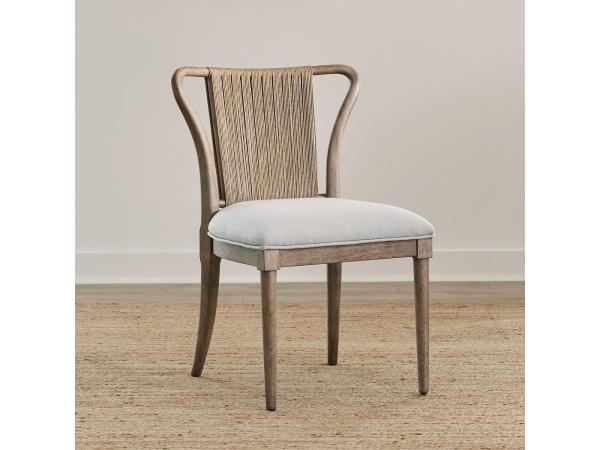 This ready-to-assemble side chair features a distinctive shaped back with corded detail. Its design offers a unique seating option for any dining or living space.