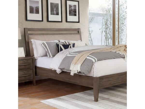 A linen-like fabric padded headboard highlights this bedroom set with a pronounced warm gray wood grain finish. It’s a classic