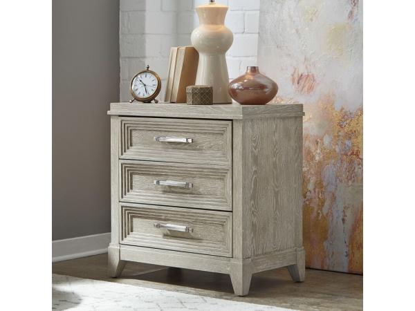 This contemporary night stand features three drawers with rubberwood solids, split heart oak veneers, and a washed taupe and silver champagne finish. It includes bottom case dust proofing, fully stained interior drawers, and satin nickel bar pull hardware