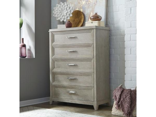This Belmar 5-drawer chest is crafted from Rubberwood solids and Split Heart Oak veneers with a contemporary washed taupe and silver champagne finish. It offers bottom case dust proofing, fully stained interior drawers, and cedar-lined bottom drawers for