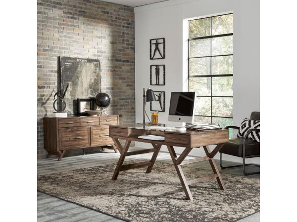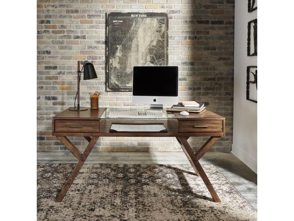 This 60" Lennox writing desk is crafted from rubberwood solids with white oak veneers and features a weathered chestnut finish. It includes two full extension drawers and a unique floating tempered glass insert with a storage shelf beneath.