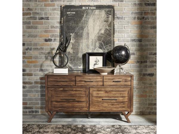 This Lennox credenza, made from rubberwood solids with white oak veneers, features a weathered chestnut finish and heavy wire brush distressing. It includes three storage drawers, two lateral file drawers, and an angled leg base.