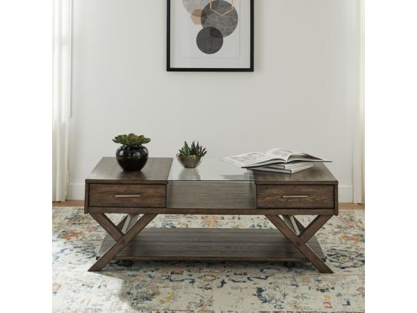 This Lennox display cocktail table is crafted from rubberwood solids with split heart white oak veneers and a weathered chestnut finish. It features a planked top, two full extension drawers, a tempered glass insert, a bottom shelf, and an angled leg base