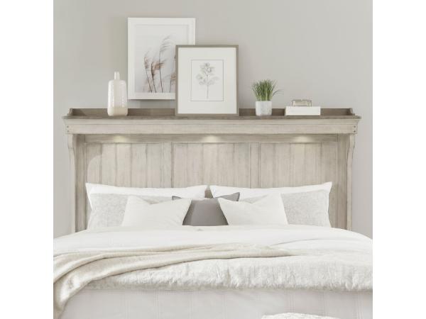 This Ivy Hollow King mantle headboard includes convenient LED touch lighting, perfect for reading in bed. Crafted from poplar solids with pine and alder veneers, it showcases a weathered linen finish and a distinctive shaped mantle crown.