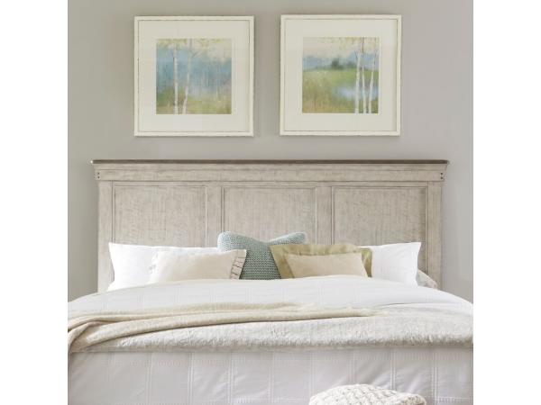 This Ivy Hollow Queen panel headboard features heavy wire brushing and saw marks, finished in a two-tone weathered linen with a dusty taupe top cap. Constructed from poplar solids with pine and alder veneers, it offers rustic elegance for your bed.