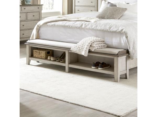 This Ivy Hollow Queen upholstered bench footboard features a padded bench seat and two open storage cubbies. Crafted from poplar solids with pine and alder veneers, it includes tapered feet and a weathered linen finish.