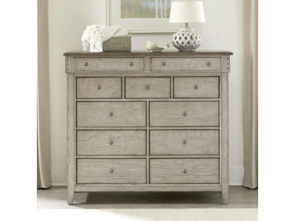 This Ivy Hollow 11-drawer chesser is crafted from poplar solids with pine and alder veneers, showcasing distressed weathered linen and dusty taupe finishes. It provides extensive storage with eleven full extension drawers, featuring felt-lined top and ced