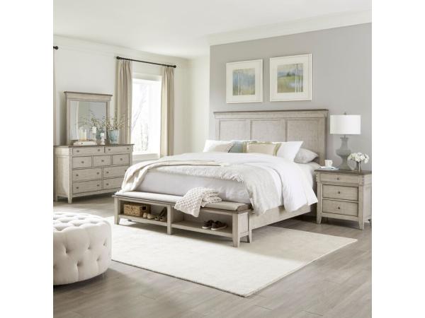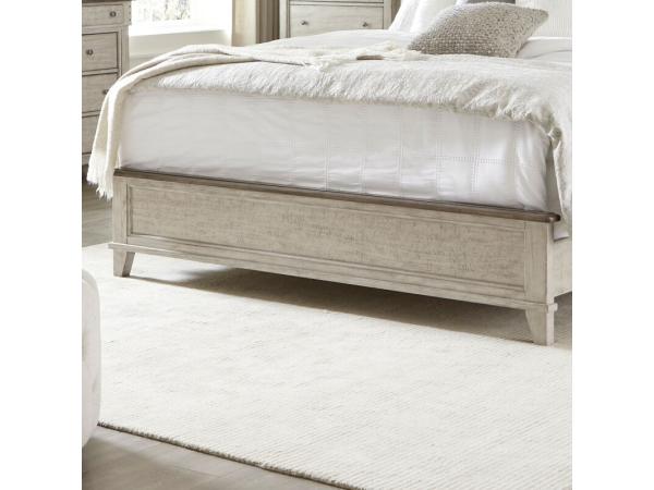 This Ivy Hollow King panel footboard showcases heavy wire brush and sawmark distressing in a two-tone weathered linen finish. Made from poplar solids with pine and alder veneers, it features tapered feet for a complete bed setup.