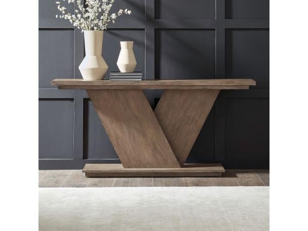 This sofa table showcases a contemporary criss-cross body design and a plinth-style base. It includes an open bottom shelf for additional storage and display space.