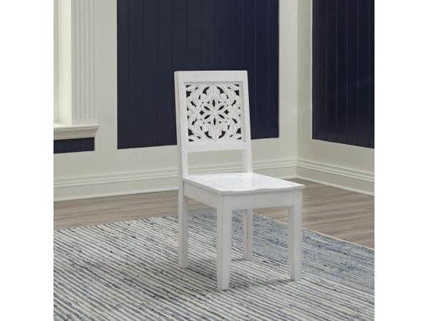 This Boho-inspired Trellis Lane accent chair is crafted from solid mango with a weathered white finish and a hand-carved chair back. It features a saddle-shaped wooden seat and block tapered legs.