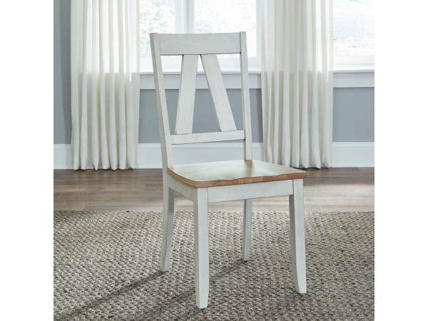 This Lindsey Farm splat back side chair, crafted from rubberwood solids, features a weathered white and sandstone finish. It includes an inverted V design, a comfortable saddle seat, and nylon glides to protect flooring.