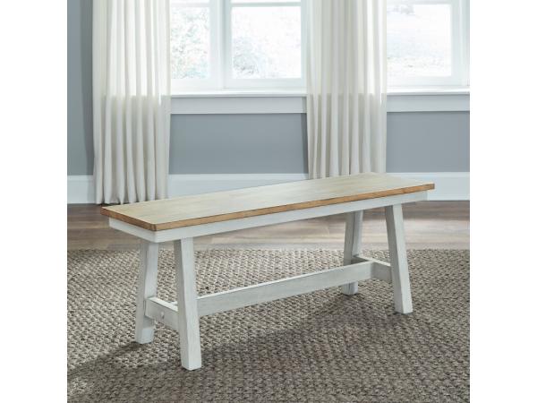 Crafted from rubberwood solids, the Lindsey Farm backless bench features a weathered white and sandstone finish. This stylish bench includes a wooden seat and nylon glides to protect your flooring.