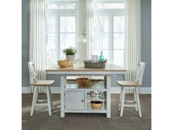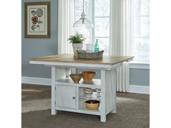 This kitchen island tabletop is crafted from rubberwood solids and veneers with MDF, featuring a weathered white and sandstone finish. It includes an 18-inch self-storing leaf on an easy guide system for flexible dining space.