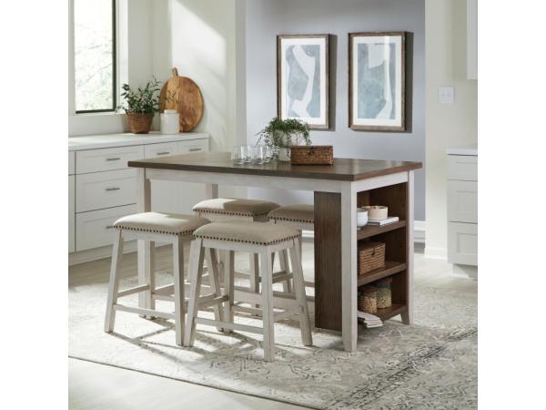 This Brook Creek 5-piece counter set for small spaces features a two-tone bookcase table with fixed shelves and four padded counter height stools. The stools have upholstered seats and antique brass nail head accents.