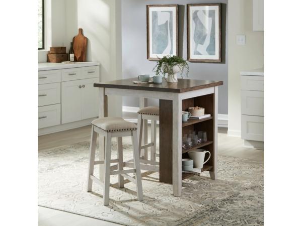 This Brook Creek 3-piece counter set, ideal for small spaces, features a two-tone bookcase table with fixed shelves and tapered legs. It includes two padded counter height stools upholstered in classic white linen with nail head accents.