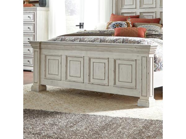 This King mansion footboard is crafted from Rubberwood solids with a distressed Whitestone finish, featuring a heavy top crown and raised panels with bead molding. Large pilaster style posts add architectural detail to this bed component.