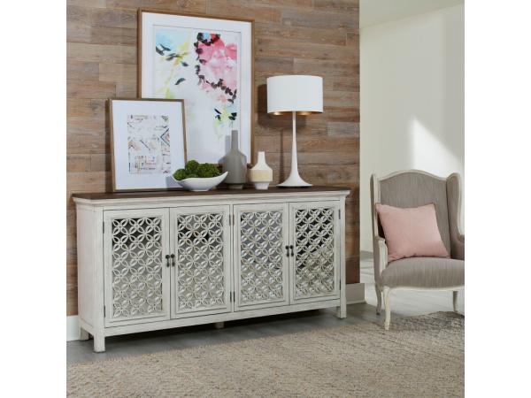 This 72-inch Westridge accent cabinet features Eucalyptus solids and Ash veneers in an antique white finish. It has four mirrored doors with decorative floral overlays, a fixed shelf, and wire management provisions.