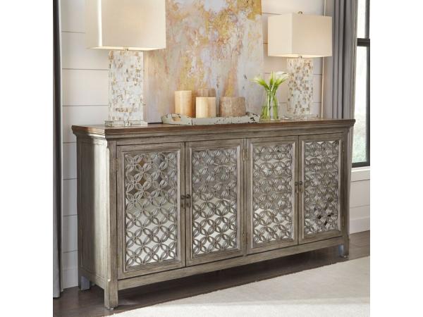 This 72-inch Westridge accent cabinet features Eucalyptus solids and Ash veneers in a wire brushed gray and white finish. It has four mirrored doors with decorative floral overlays, a fixed shelf, and wire management provisions.