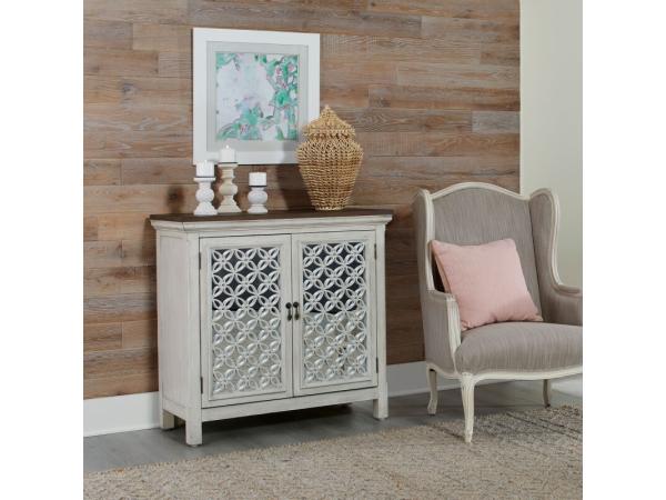 Crafted from Eucalyptus solids and Ash veneers with an antique white finish and worn wood top, this 38" accent cabinet features two mirrored doors with decorative floral pattern overlays. It includes a concealed fixed shelf for storage.