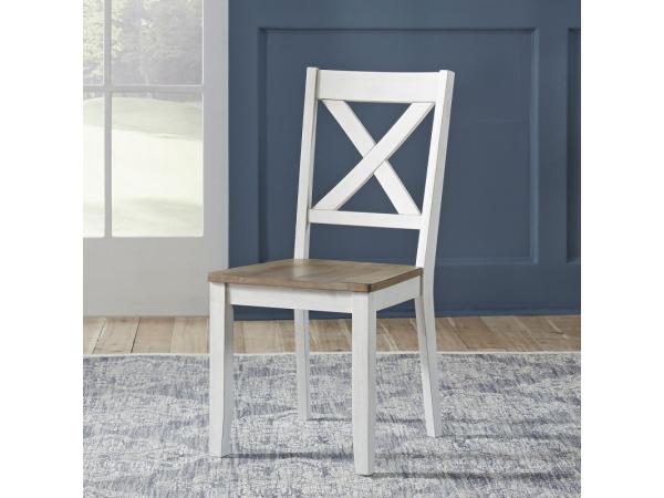 Crafted from rubberwood solids with a two-toned white and wood finish, this traditional Lakeshore X back side chair features a comfortable saddle seat and nylon glides to protect flooring.