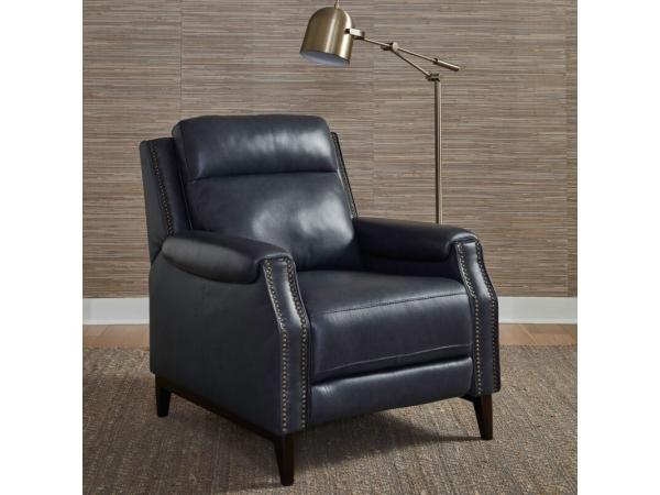 This manual pushback recliner features a divided back design, pad-over track arms, and antique brass nail head trim. It is upholstered in York Navy leather and built on a solid hardwood frame for durability.