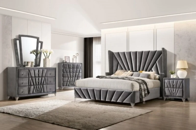 The ultimate Art Deco-inspired mirror! The elegance, glamour and vintage appeal of 1930’s Hollywood is right here! The decadent gray velvet upholstery looks like it came right out of a classic old movie! There’s a prestige with the unique design that seems to capture all of the excitement of a beloved bygone era! The tiered frame recalls the logo designs of the classic major studios, faithfully enhancing this cinematic reality.