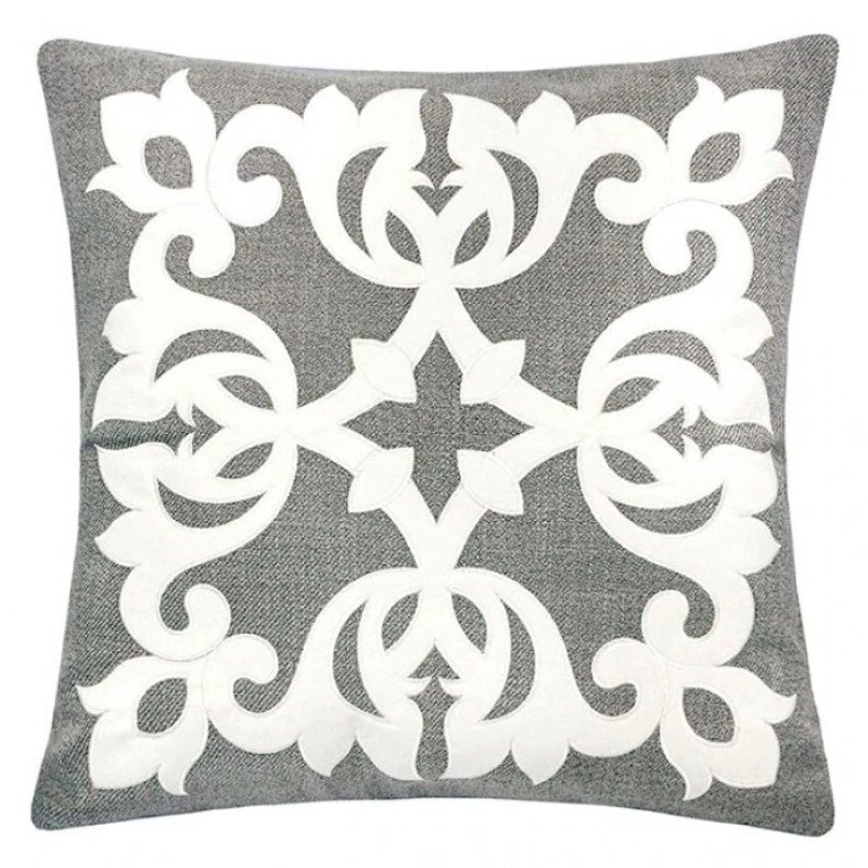 Solid color serve as a bold backdrop for the intricate white embroidery of this classic pillow.