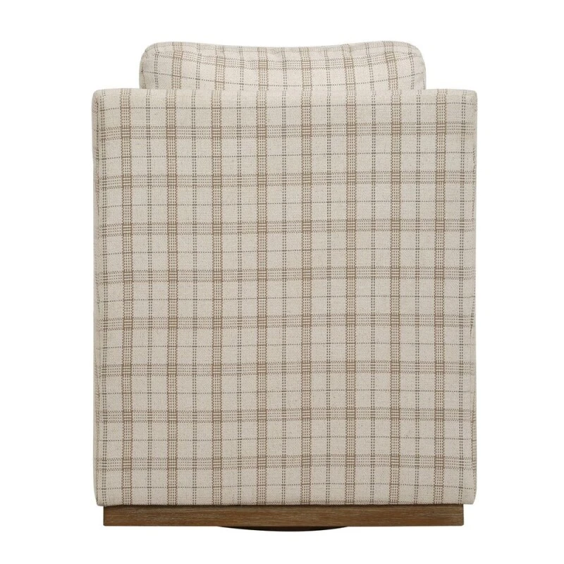 Experience effortless style and comfort with this swivel club chair featuring a solid wood plinth base in natural oak. Tailored in a casual linen blend plaid in beige and taupe tones.