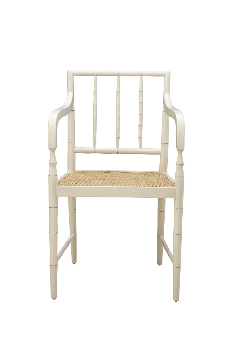 A modern take on classic bamboo-inspired elegance, the Cream Reynolds Arm Chair brings effortless charm to any space. Crafted from sustainably grown mahogany with a soft cream-white finish, this chair showcases an intricate faux bamboo frame that adds visual interest and a touch of sophistication. The cane seat provides both comfort and natural texture, making it an inviting choice for a dining room, sunroom, or accent seating. Blending classic influences with a refined finish, the Cream Reynolds Arm Chair is designed to elevate and enhance with timeless style.