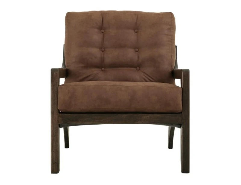 The Balam armchair features a wooden frame with a dark finish, offering a blend of modern style and timeless charm. The seat and backrest are upholstered in brown faux leather, accented with elegant button tufting for added sophistication. With its thick cushioning and sturdy structure, this armchair combines comfort and durability. Its refined design is perfect for lounging in style.