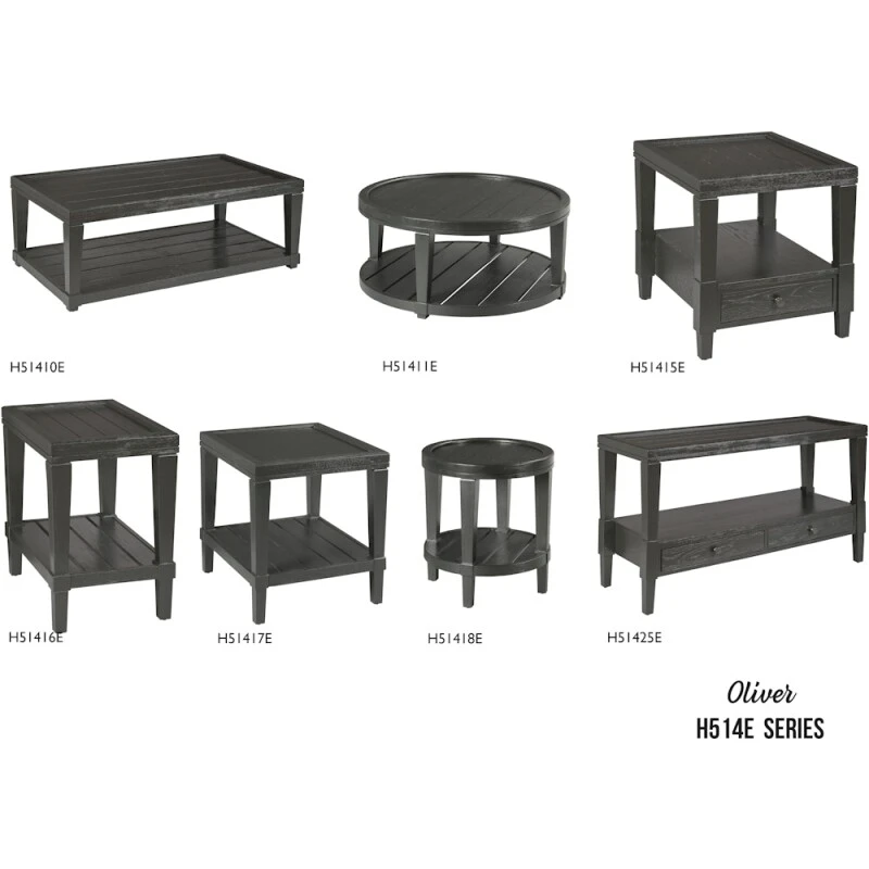 The Oliver collection includes a rectangular cocktail table, round cocktail table, rectangular end table, rectangular chairside table, round end table, and sofa table.
